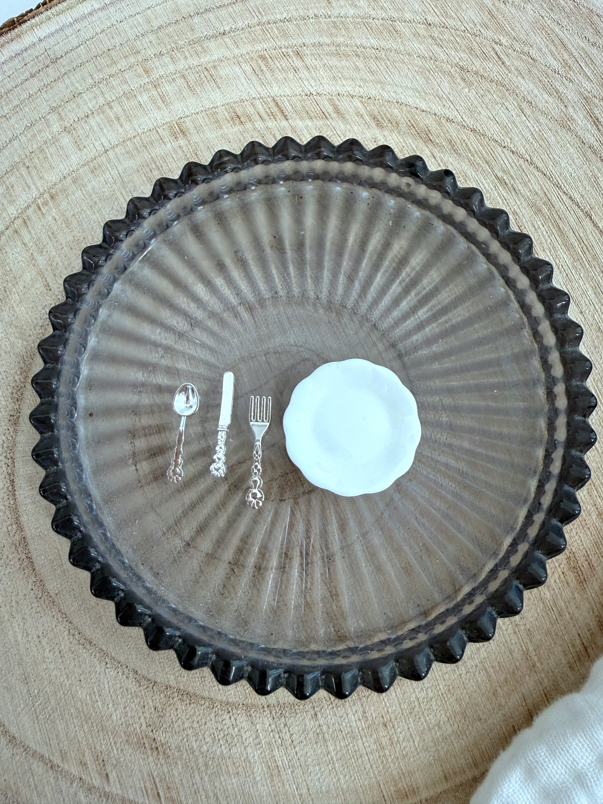 - Größe: Teller: 2,5cm Durchmesser, Besteck: 1,9cm lang