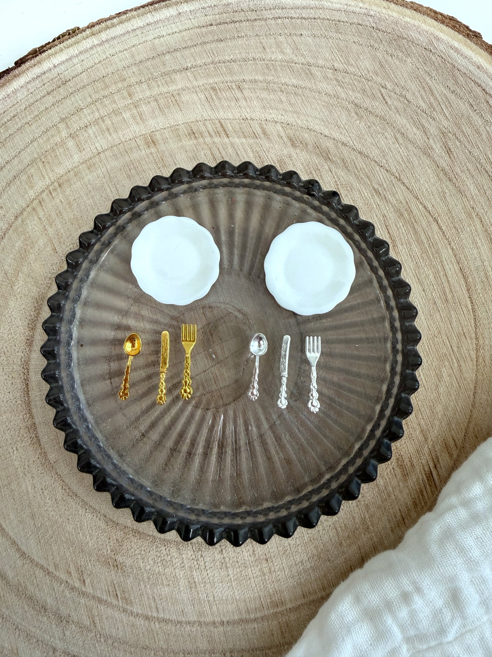 3D Miniatur - Geschirr, Teller mit Besteck Gold oder Silber - 8 Teile