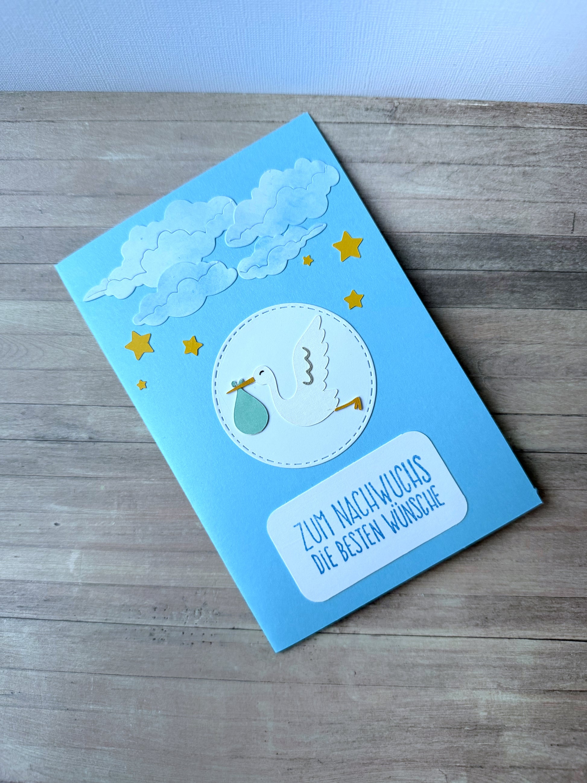 Mit dieser blauen Grußkarte lassen sich die Glückwünsche zur Geburt super süß verpacken. Die Karte ist verziert mit einem Storch der durch die Luft fliegt.