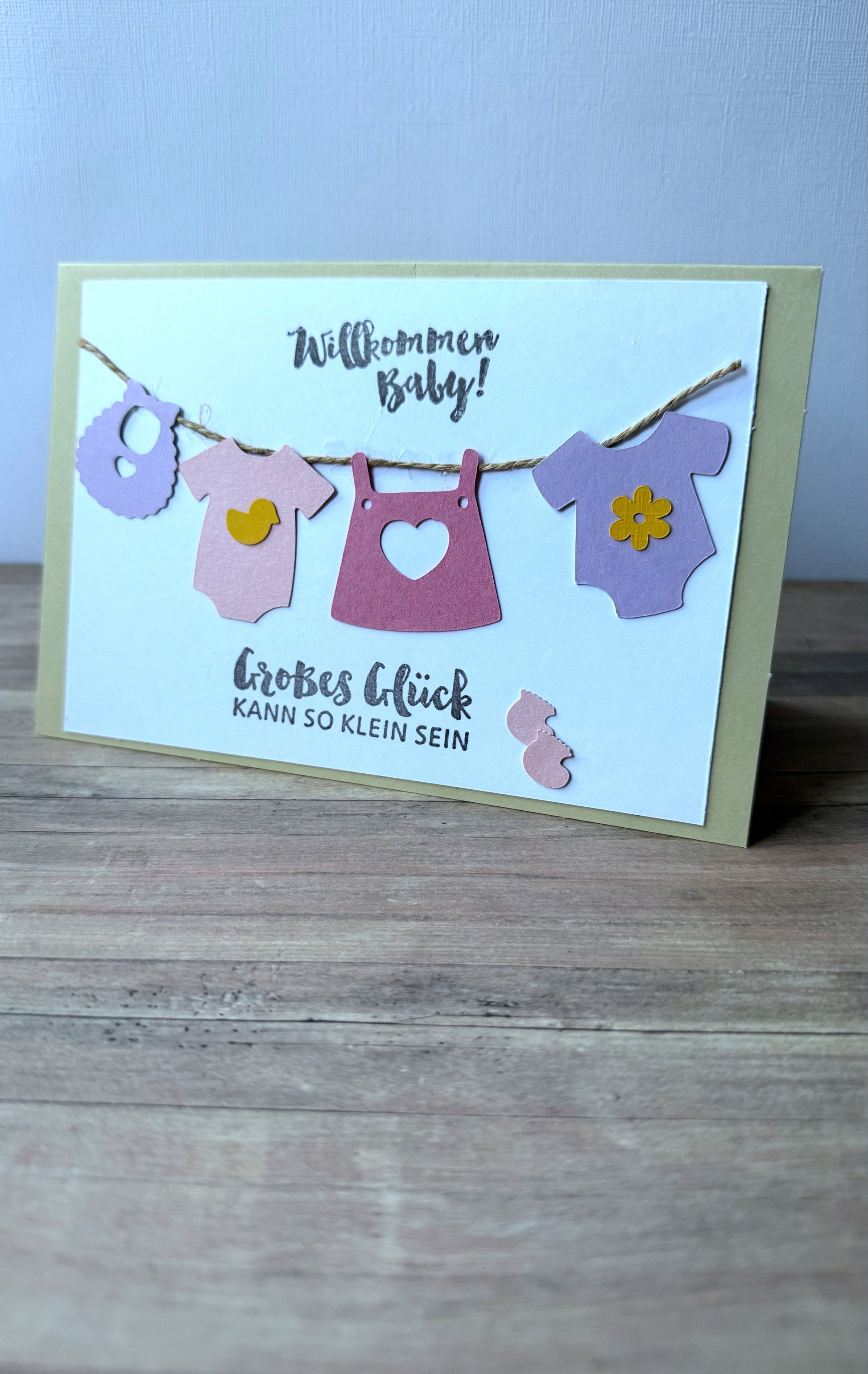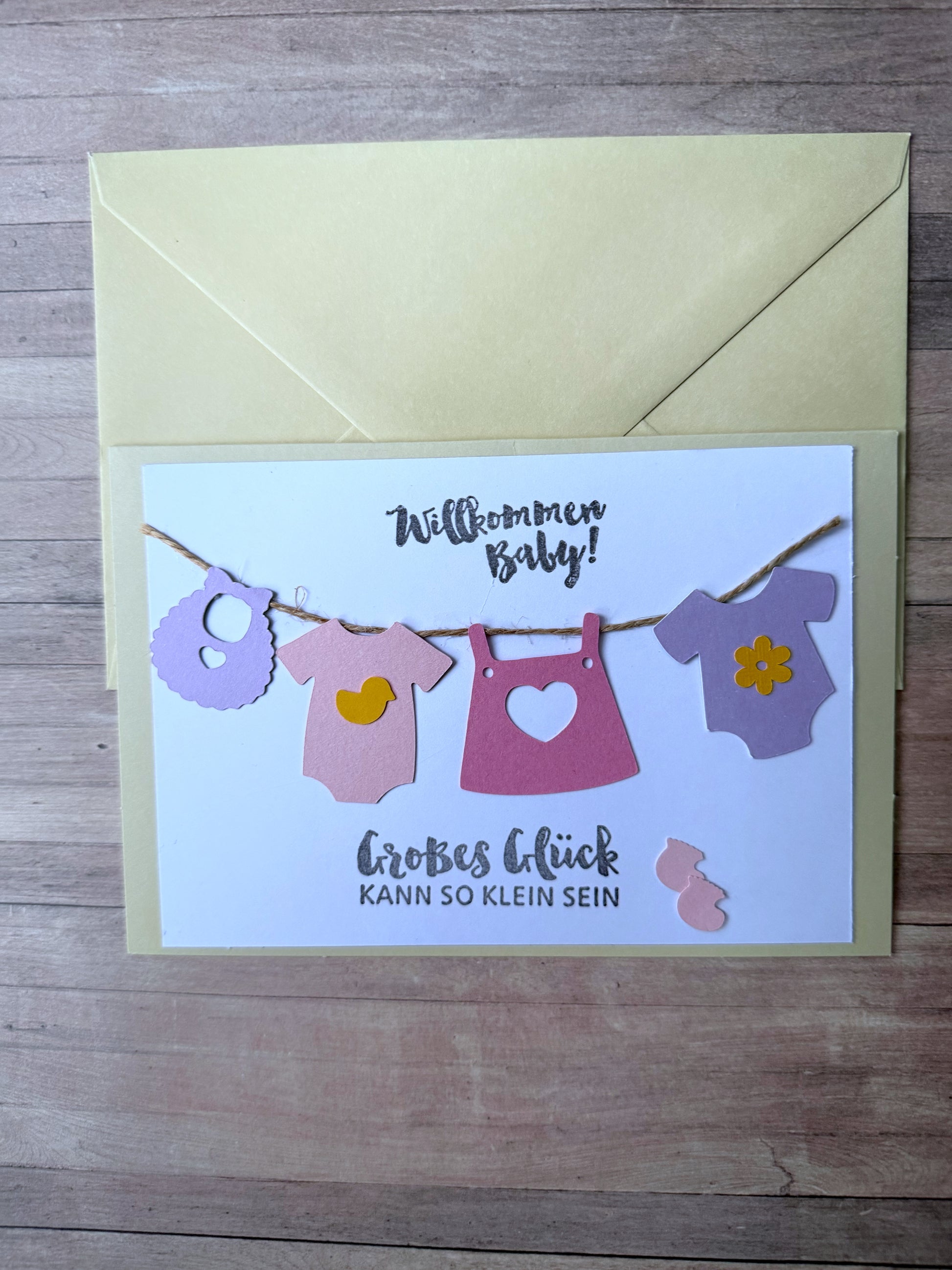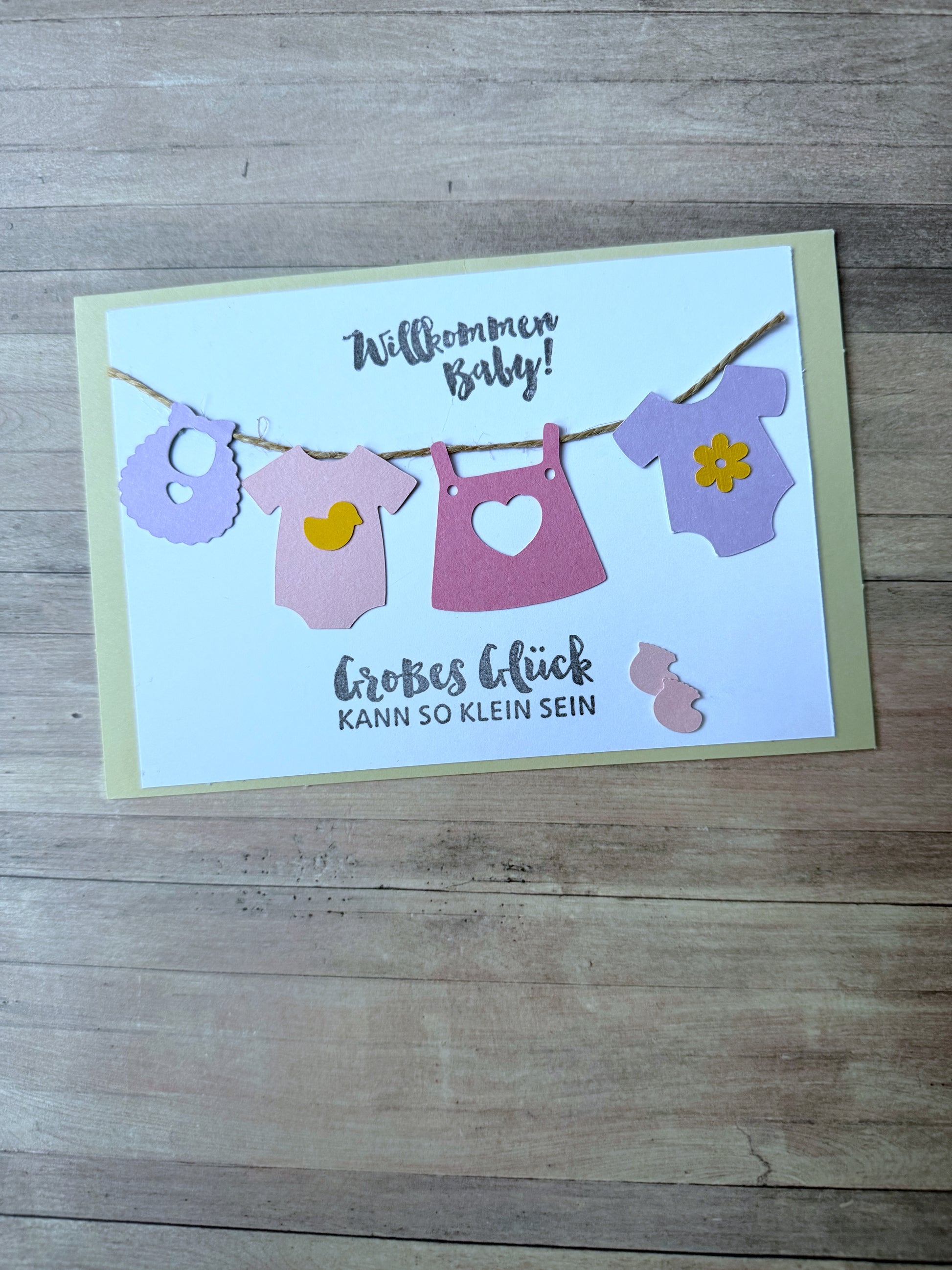 Mit dieser rosa Grußkarte lassen sich die Glückwünsche zur Geburt super süß verpacken. Die Karte ist verziert mit einer Wäscheleine, an der passende Kleidung für Babys hängt.
