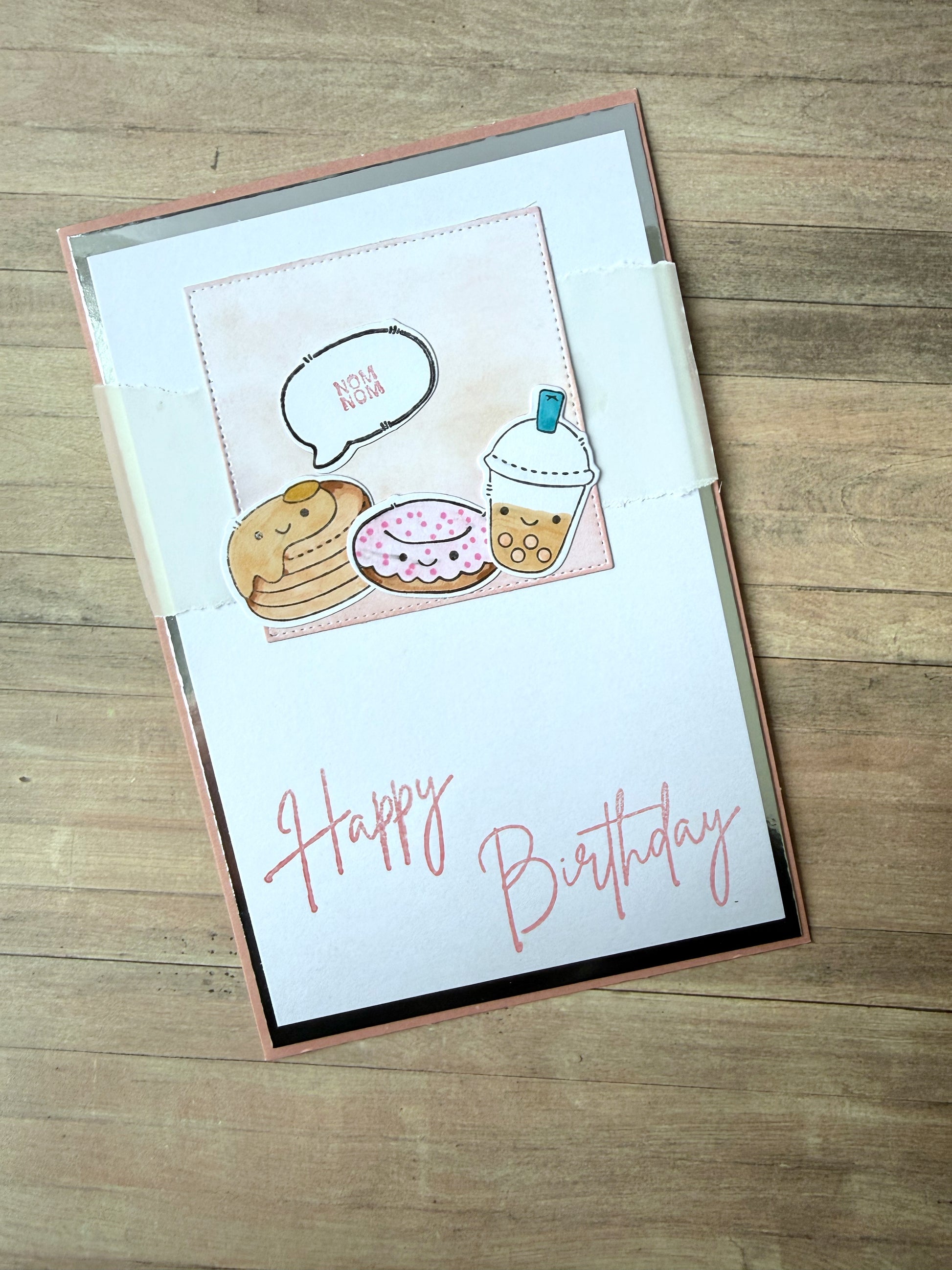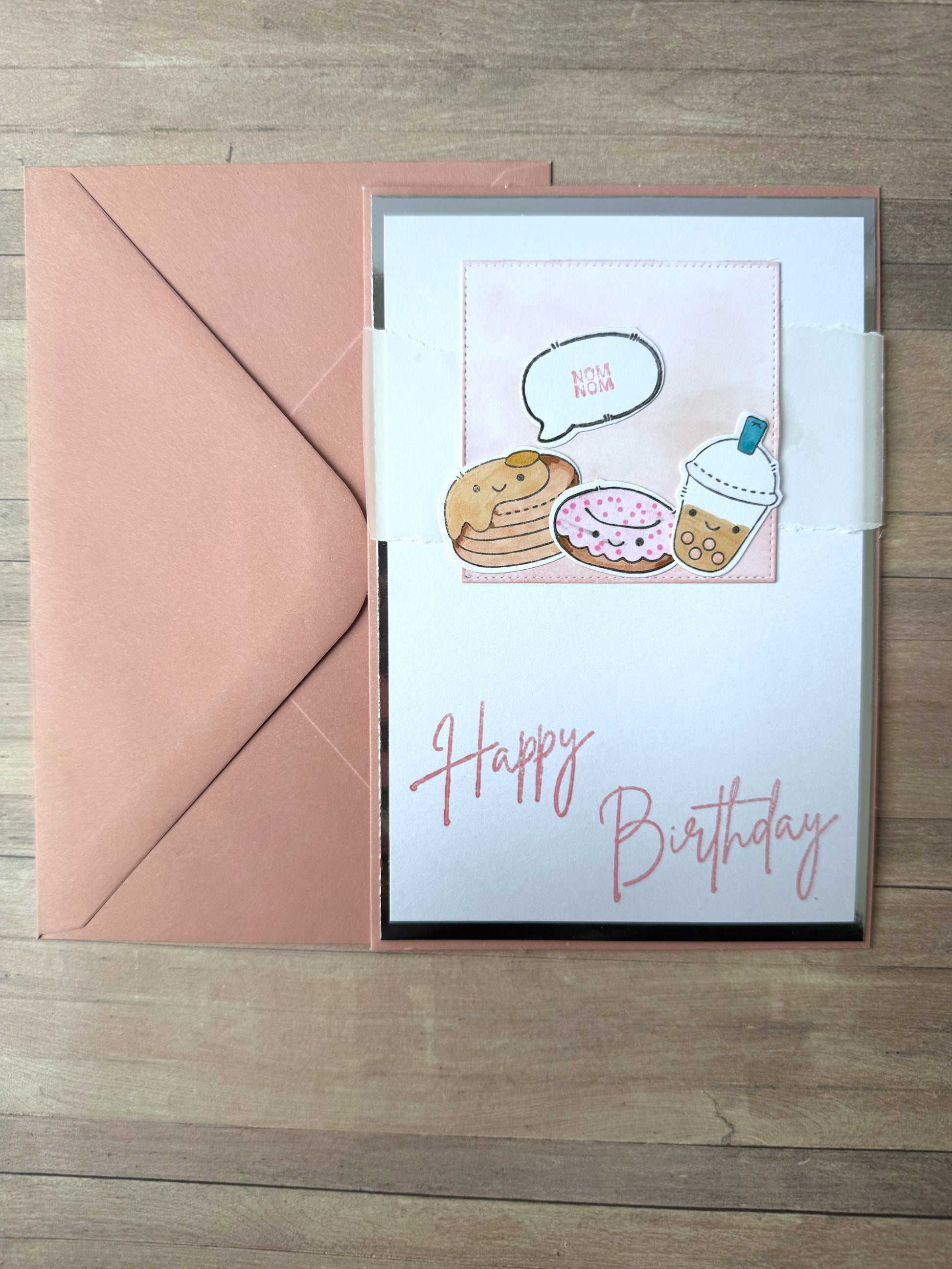 Eine Glückwunschkarte für jeden Liebhaber von Donuts, Pancakes und anderem süßen Gebäck. Diese niedliche Karte ist der perfekte Platz für persönliche Glückwünsche.