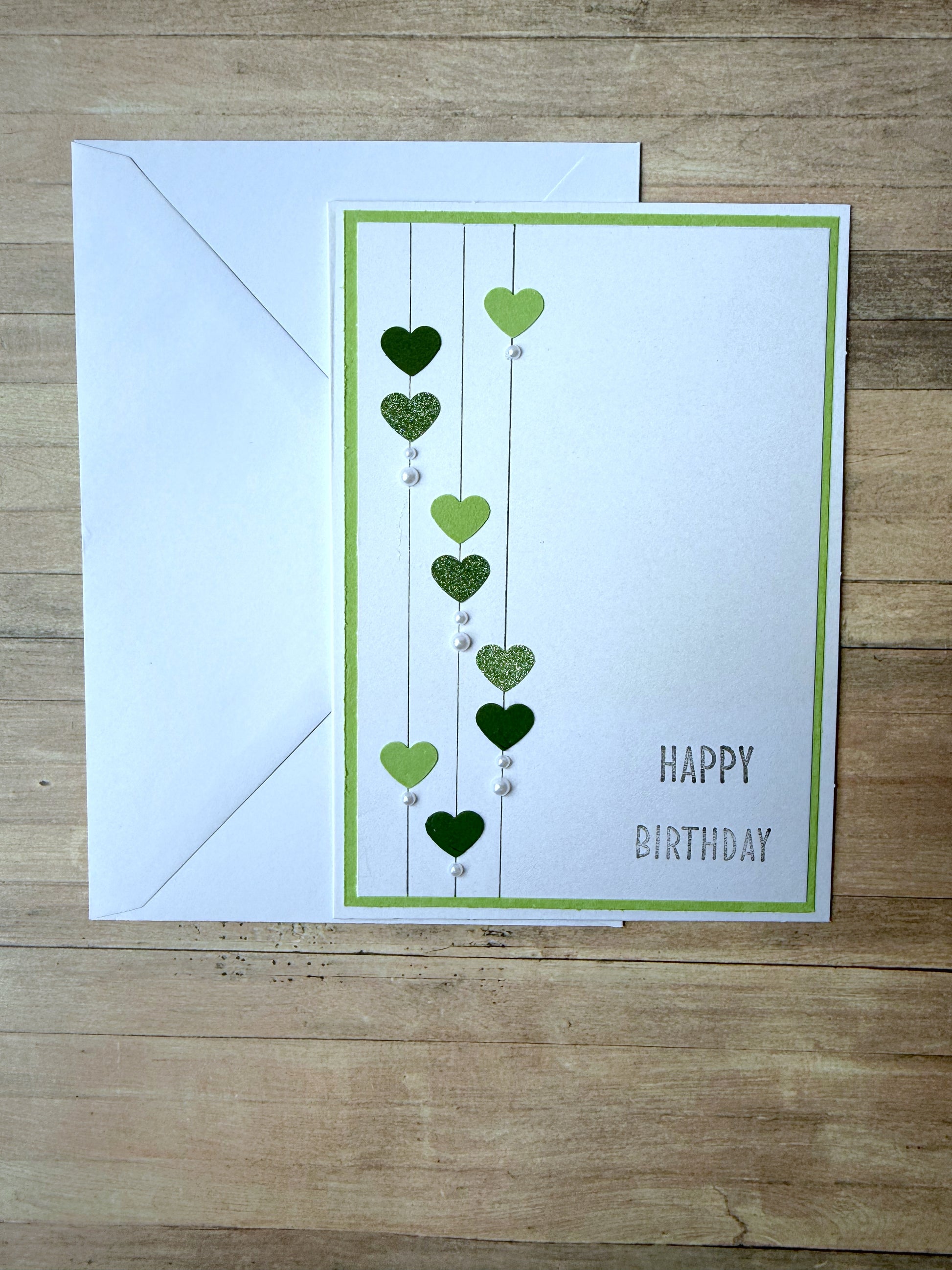 Eine schlichte edle Glückwunschkarten zum Geburtstag. Verziert verschiedene grünen Herzen und Perlen. Passend zum Geburtstag wurde ein "Happy Birthday" aufgestempelt.