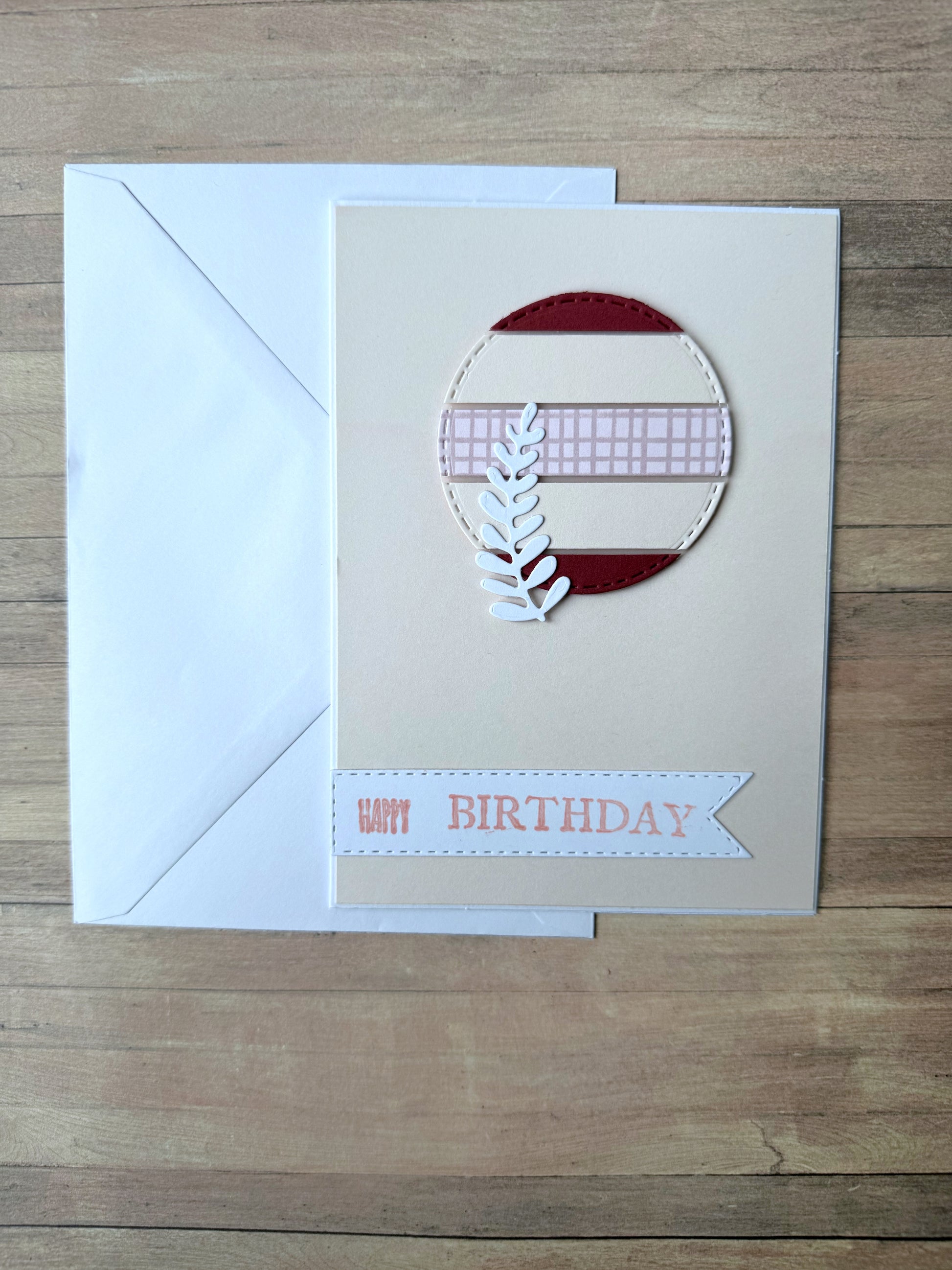 Eine schlichte edle Glückwunschkarten zum Geburtstag. Verziert mit einem Kreis in verschiedenen rosa Tönen und dem Spruch "Happy Birthday"